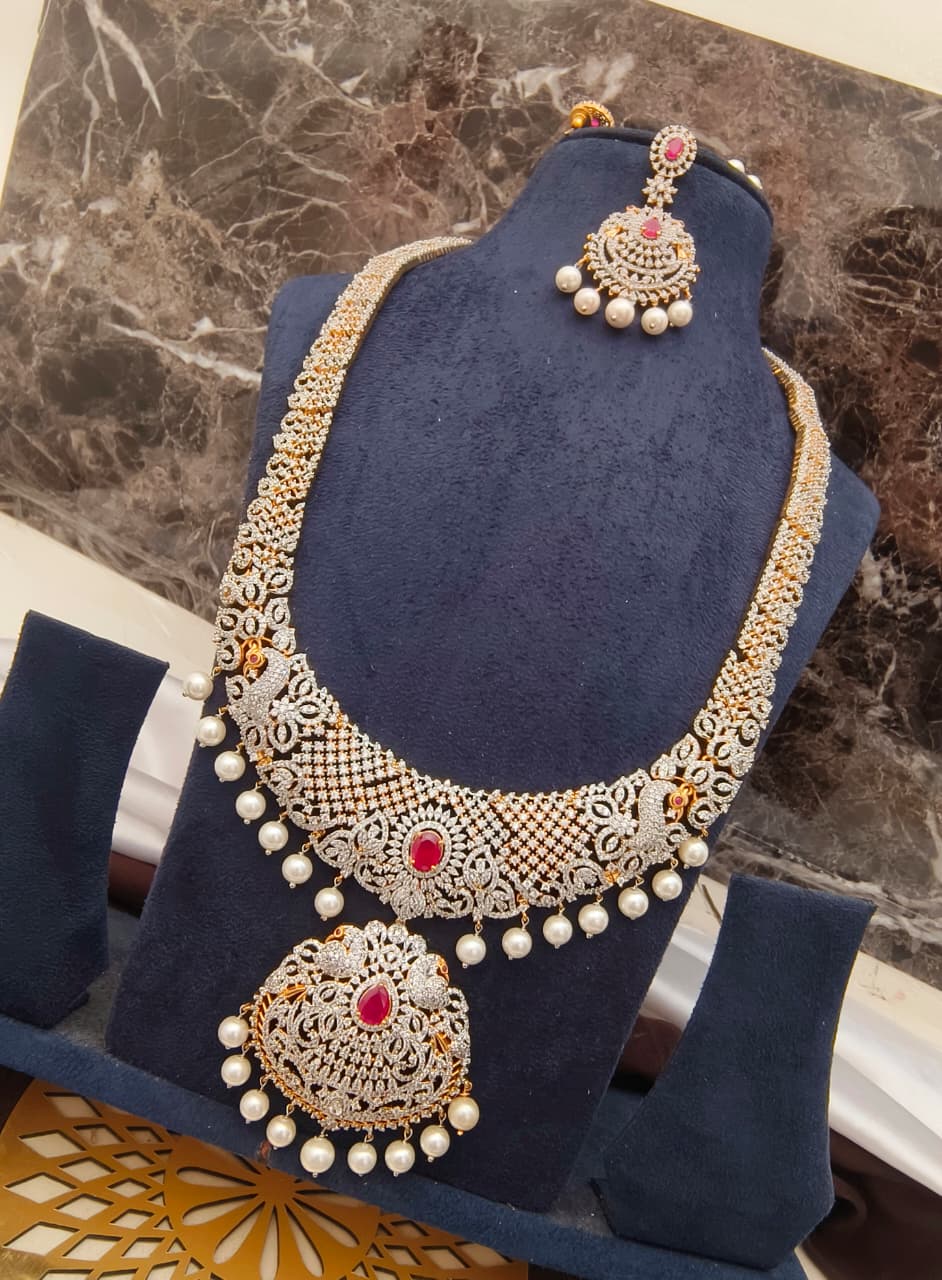 A celebration of craftsmanship and sparkle. This heavy bridal Haaram features a dense weave of shimmering white stones and rich ruby embellishments. The set comes complete with a statement pendant, matching earrings, and a traditional Tikka, making it an all-in-one jewelry solution for your most special day.