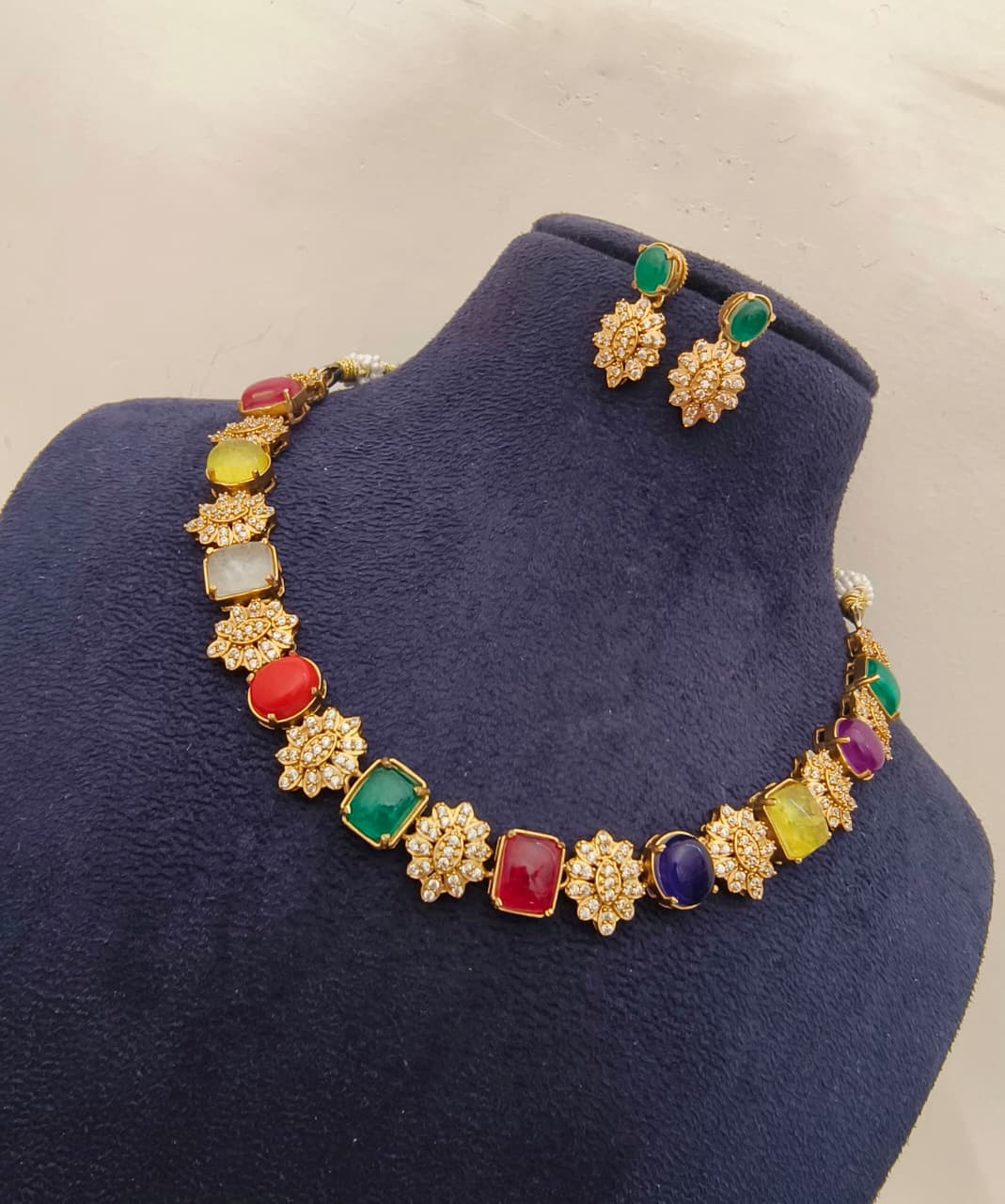 This elegant necklace set is designed with a beautiful combination of vibrant stones and intricate floral detailing. Crafted in a rich gold finish, it features a mix of green, red, pink, and multi-color stones enhanced with sparkling white accents. The unique blend of shapes and colors adds a modern yet traditional touch, making it suitable for weddings, festive occasions, and special events. Paired with matching earrings, this set offers a complete and graceful look that complements both ethnic and contemporary outfits.