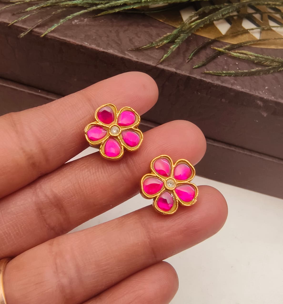 Brighten your jewelry collection with these Artisan Floral Studs, featuring a cheerful five-petal design in a striking emerald-green hue. Finished with a warm gold border and a delicate central accent, these lightweight studs offer a perfect pop of color for both everyday elegance and festive fusion looks.